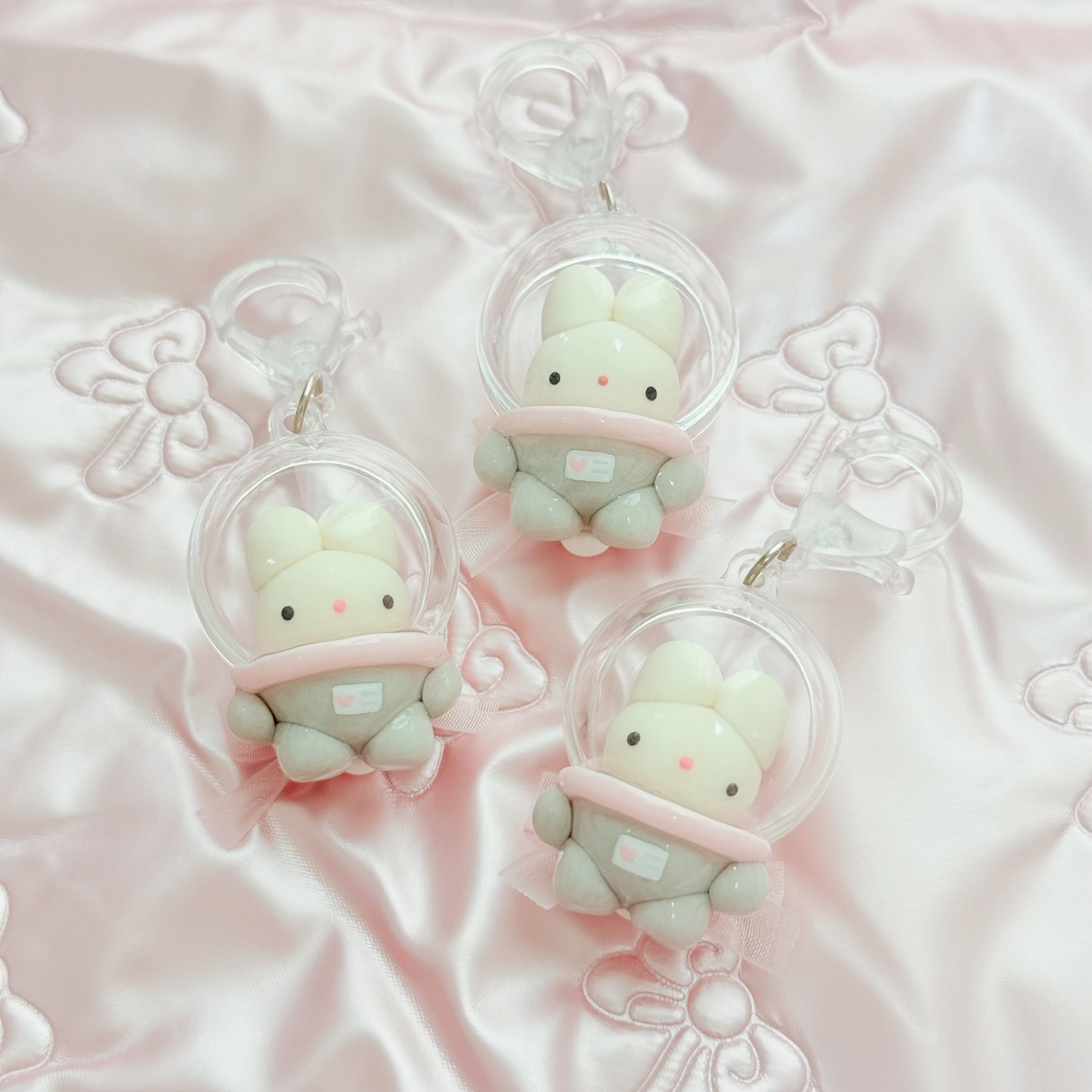 プラスチックボールと樹脂粘土で制作した宇宙を旅するうさぎさんのキーホルダーです₍ᐢ.ˬ.ᐢ₎∅.゜
